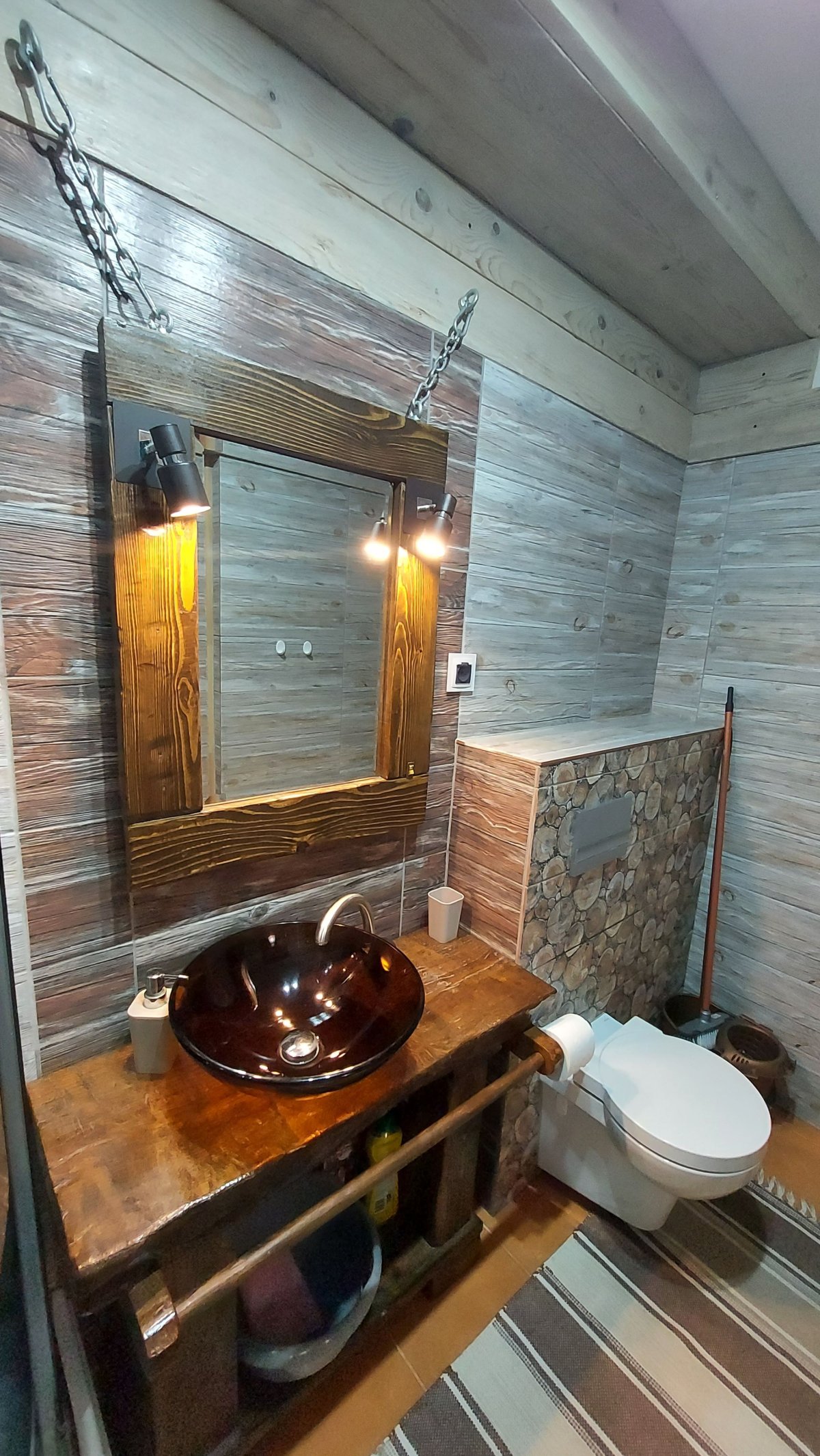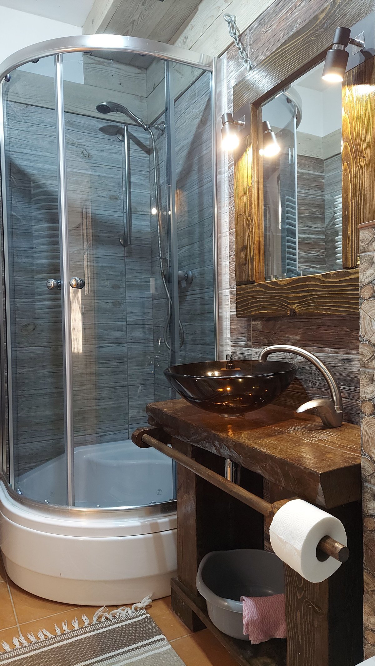 Wyposażenie łazienki stanowi umywalka z lustrem, kabina prysznicowa oraz sedes.