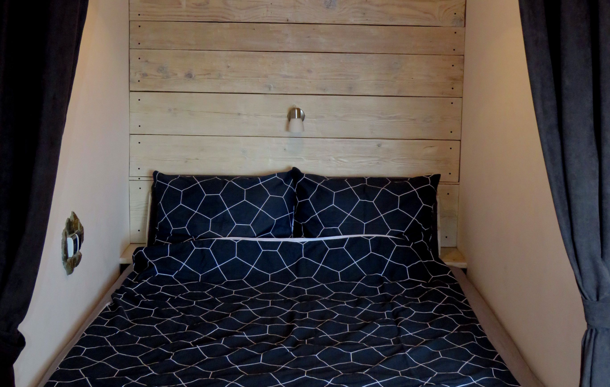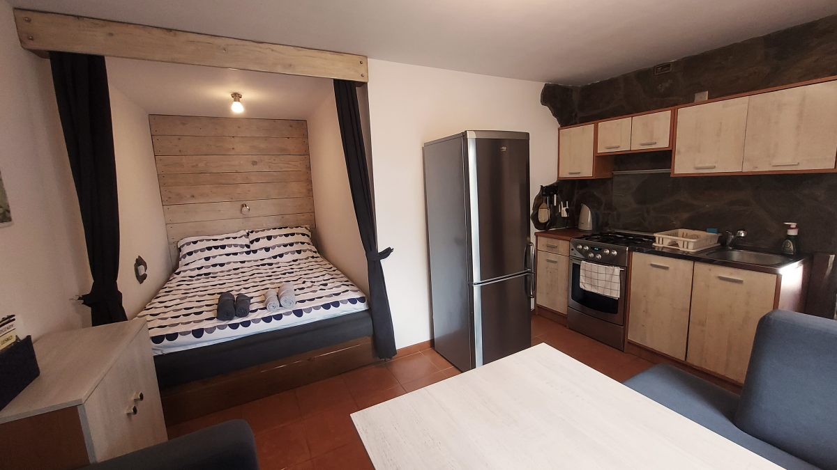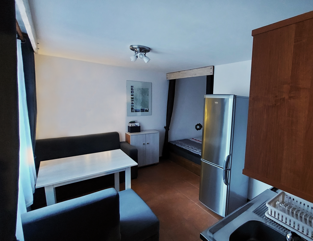 W pokoju znajduje się aneks kuchenny, kącik wypoczynkowy ze stołem, szafka oraz duże łóżko małżeńskie, usytuowane we wnęce, przesłonięte zasłoną.