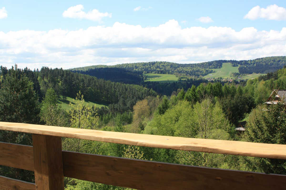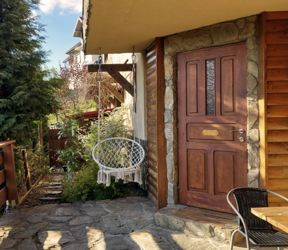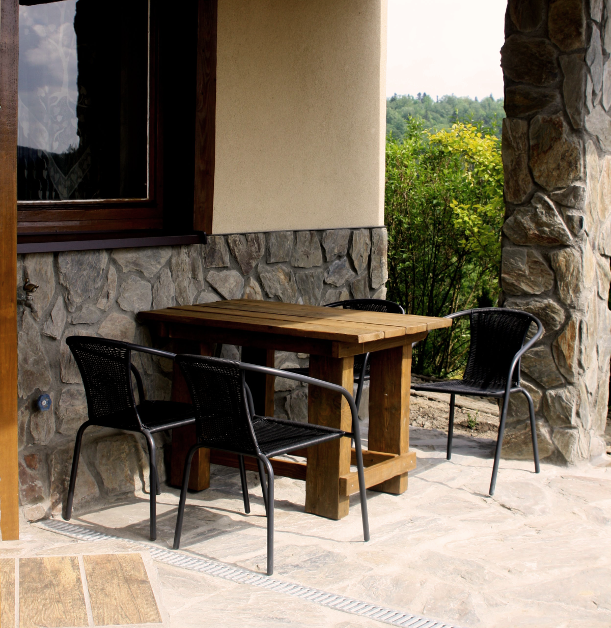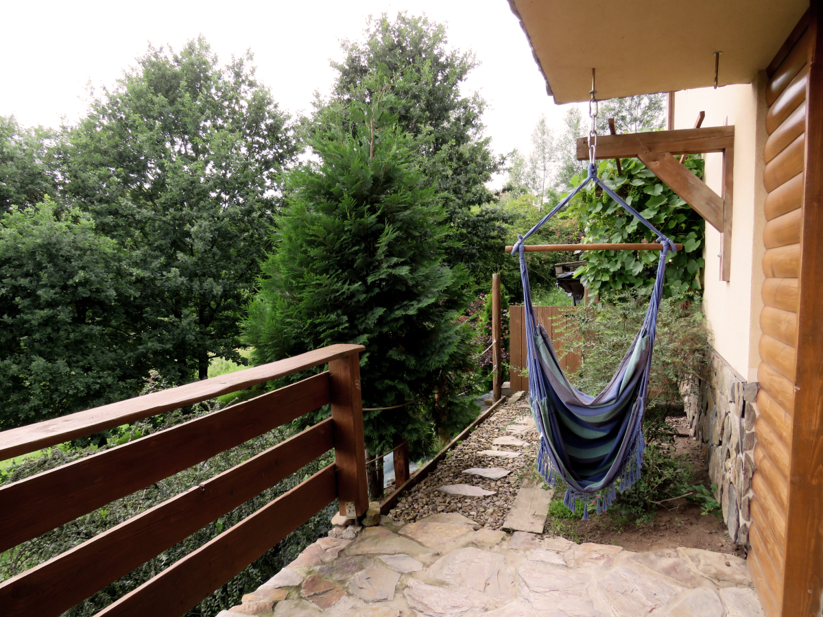 Wejście do apartamentu stanowi taras widokowy ze stołem na posiłki. Z tarasu, który jest zwrócony na południe, rozpościera się widok na okoliczne wzgórza i dolinę Sanu.